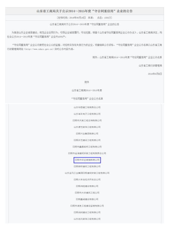 2016年8月8日,為推進山東企業(yè)誠信建設,規(guī)范企業(yè)合同行為,引導企業(yè)誠信履約、守法經營,根據《山東省守合同重信用企業(yè)公示辦法》,山東省工商行政管理局向社會公示2014~2015年度“守合同重信用”企業(yè)共4505戶,日照市華業(yè)玻璃有限公司榜上有名。